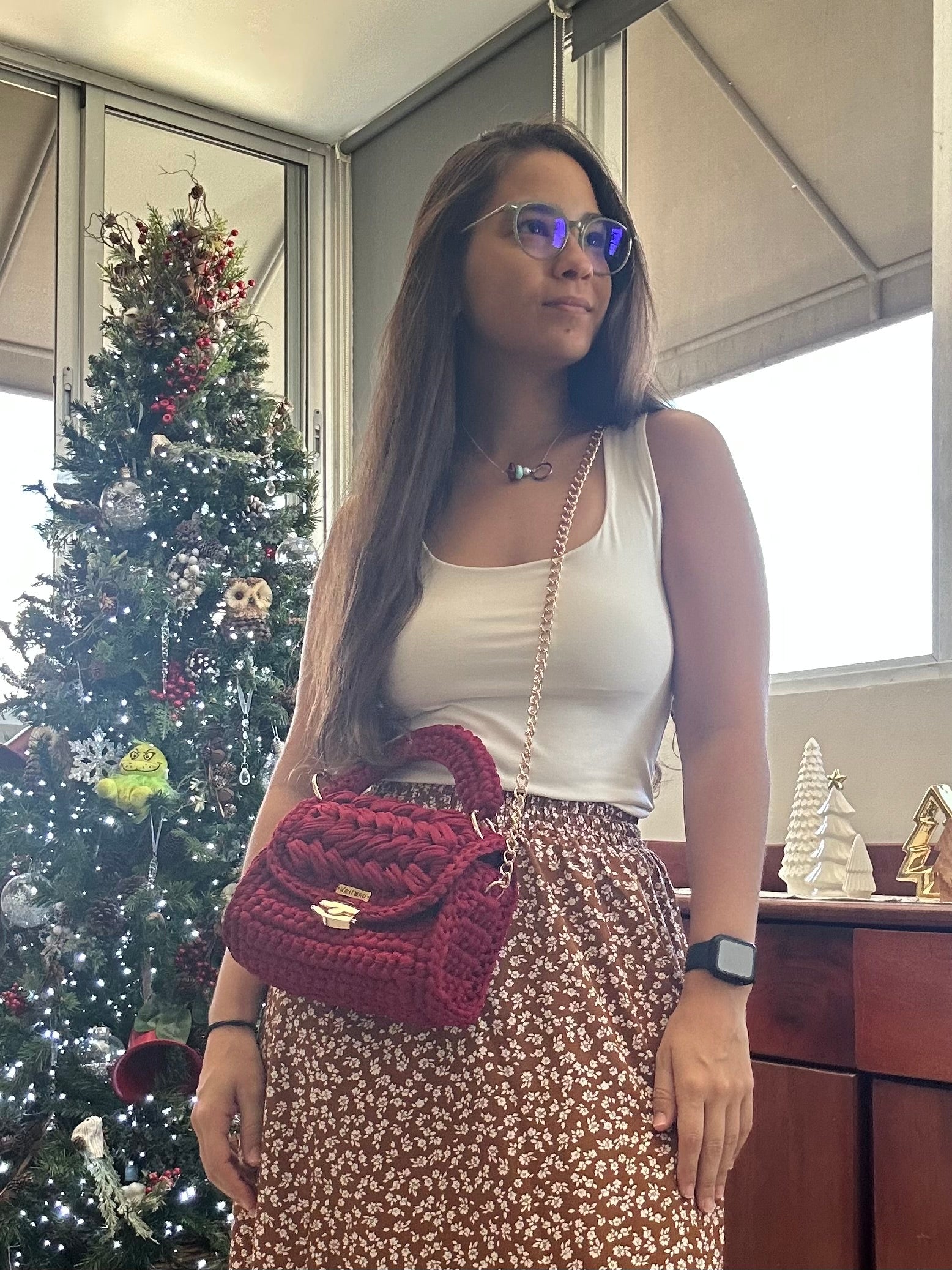Lleva asa corta y cadena larga dorada.